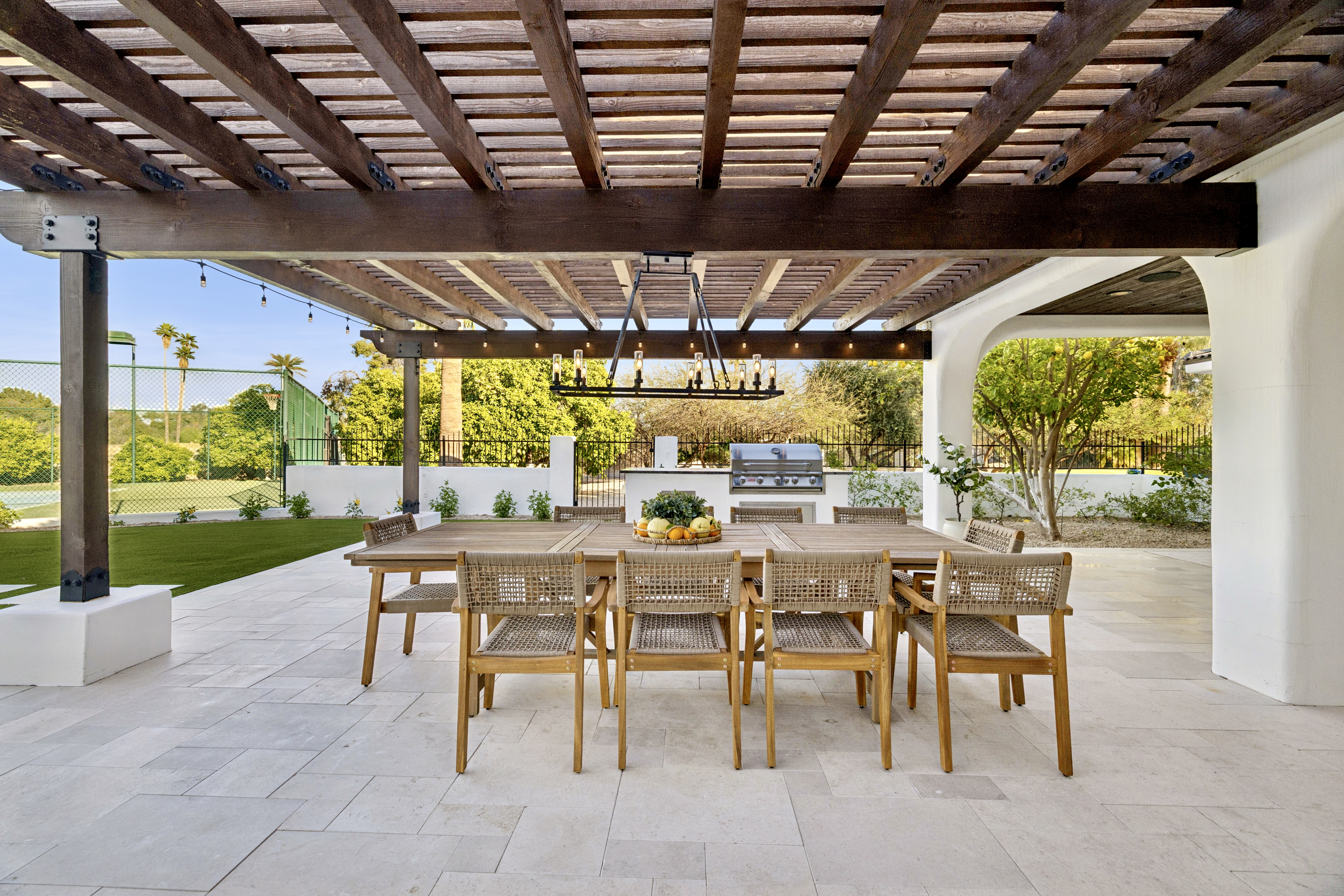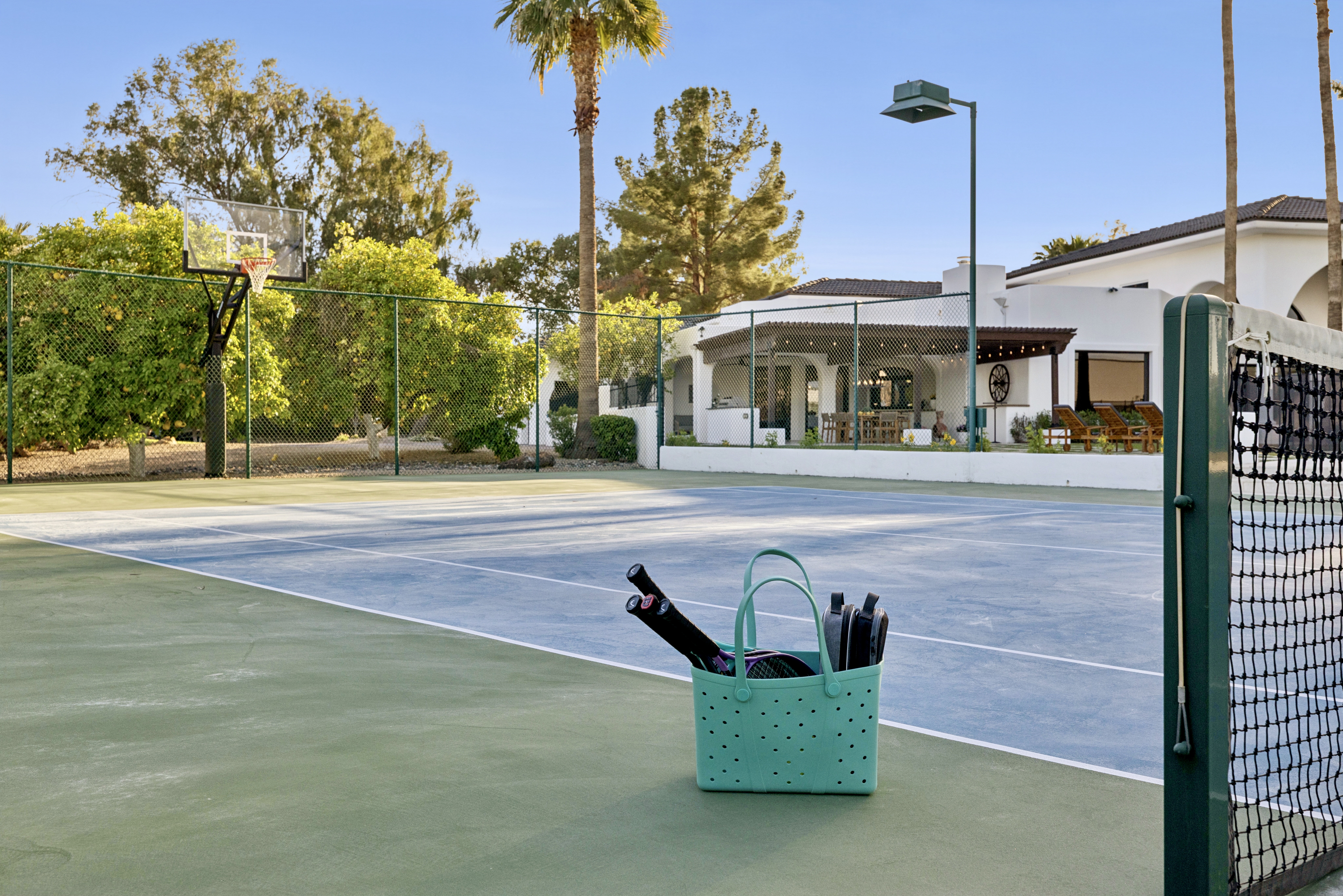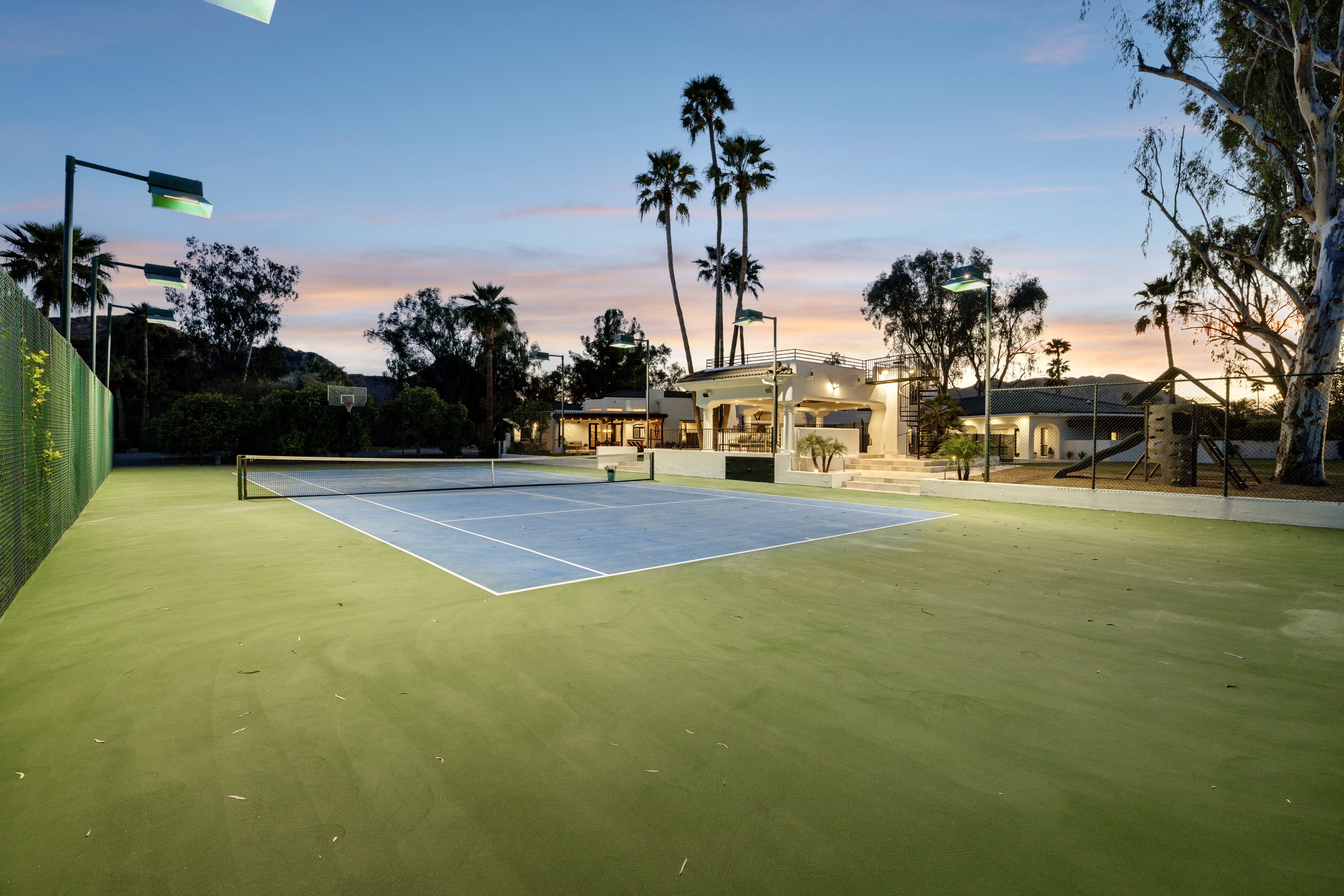 The home features five spacious bedrooms, each with its own ensuite bathroom and TV, a true chef’s kitchen complete with gas cooktop, walk-in pantry, breakfast bar, and wet bar. Additional comforts include a library, exercise room, multiple gas fireplaces, 2-story gazebo with deck, and abundant natural light from vaulted ceilings and skylights. Outside, the private oasis features a large heated pool and hot tub, full-size tennis court with pickleball lines, a two-story gazebo, built-in BBQ, and fire features surrounded by beautifully manicured grounds, mature fruit trees, and expansive lawns — all framed by dramatic desert and mountain views.