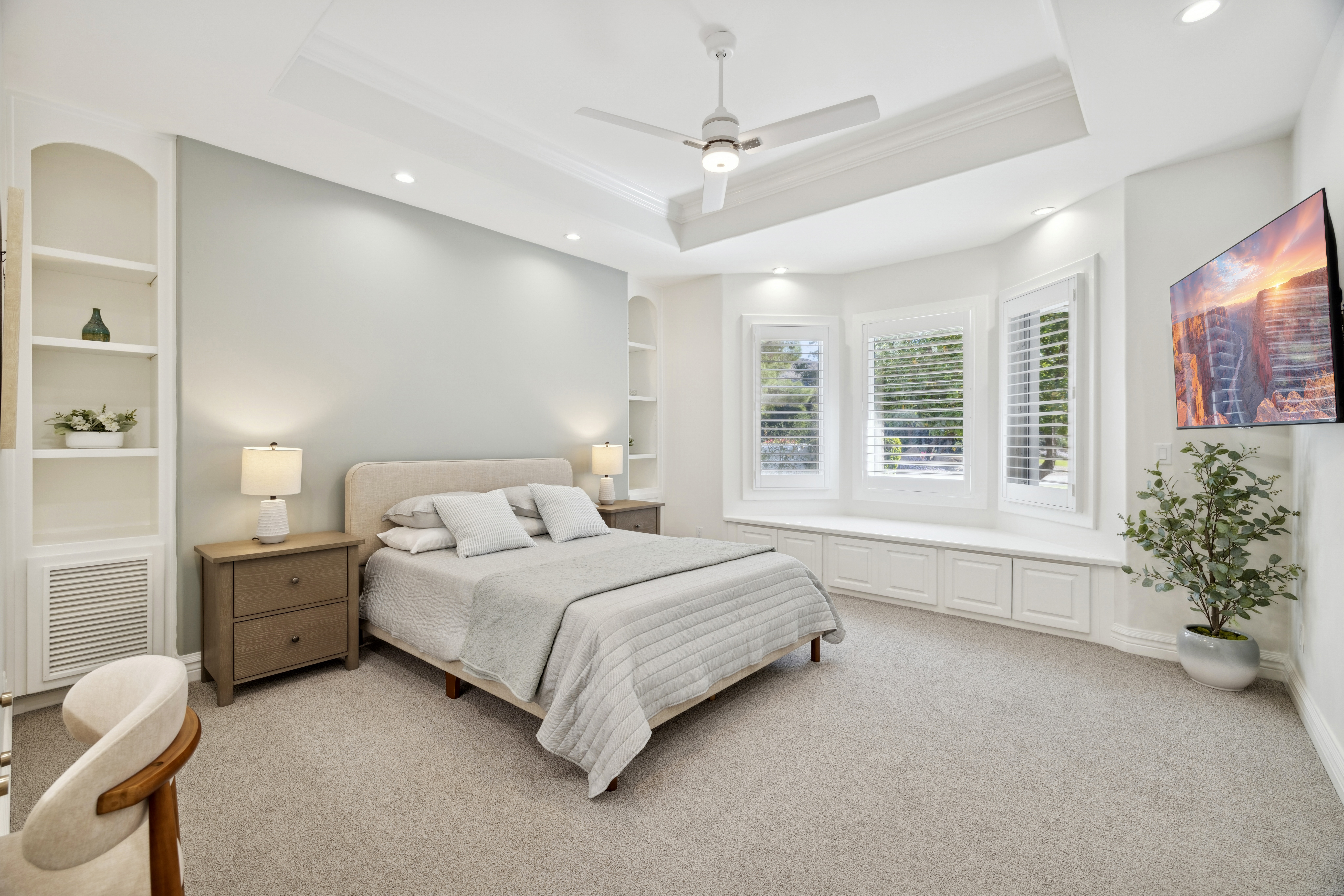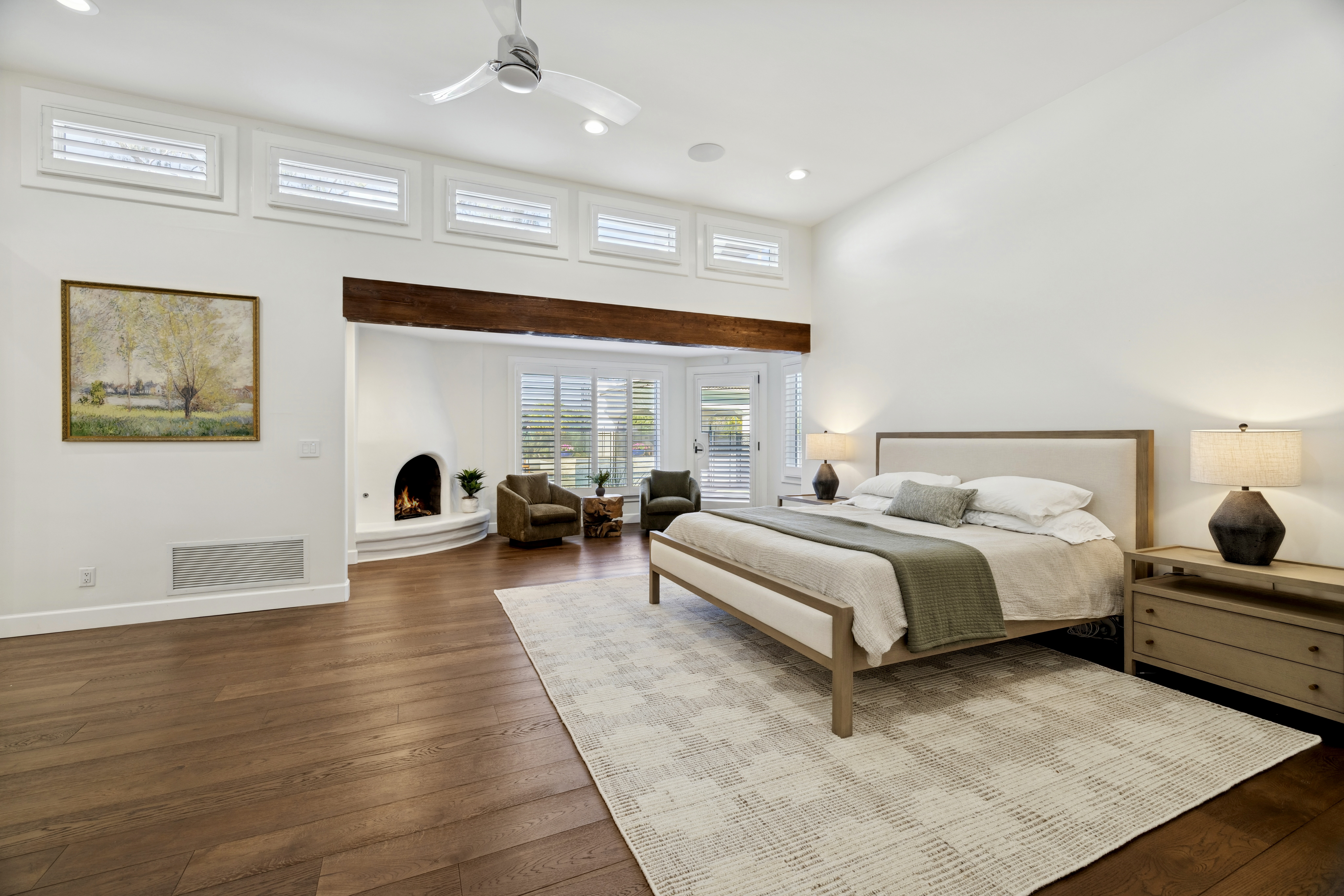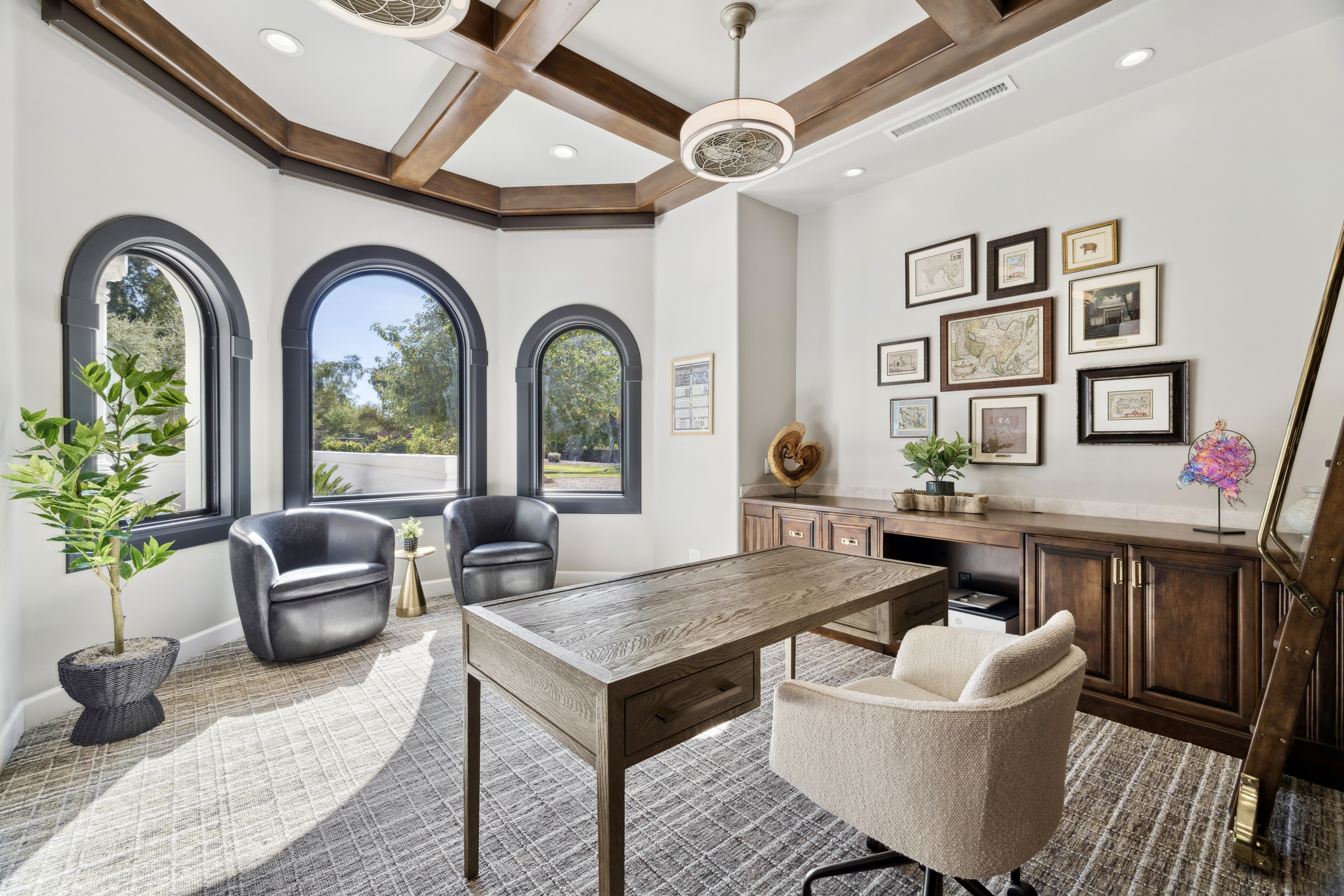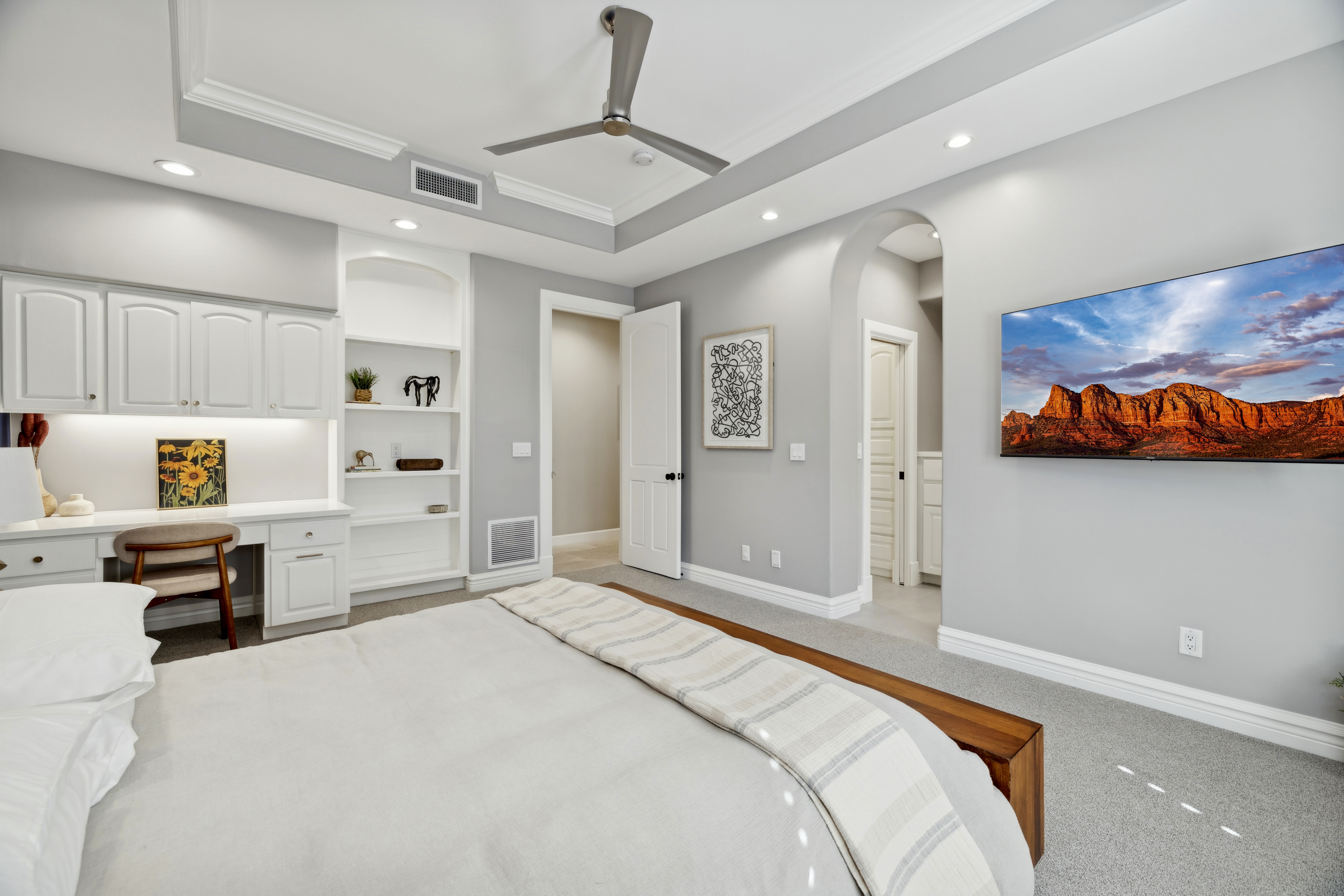 The home features five spacious bedrooms, each with its own ensuite bathroom and TV, a true chef’s kitchen complete with gas cooktop, walk-in pantry, breakfast bar, and wet bar. Additional comforts include a library, exercise room, multiple gas fireplaces, 2-story gazebo with deck, and abundant natural light from vaulted ceilings and skylights. Outside, the private oasis features a large heated pool and hot tub, full-size tennis court with pickleball lines, a two-story gazebo, built-in BBQ, and fire features surrounded by beautifully manicured grounds, mature fruit trees, and expansive lawns — all framed by dramatic desert and mountain views.